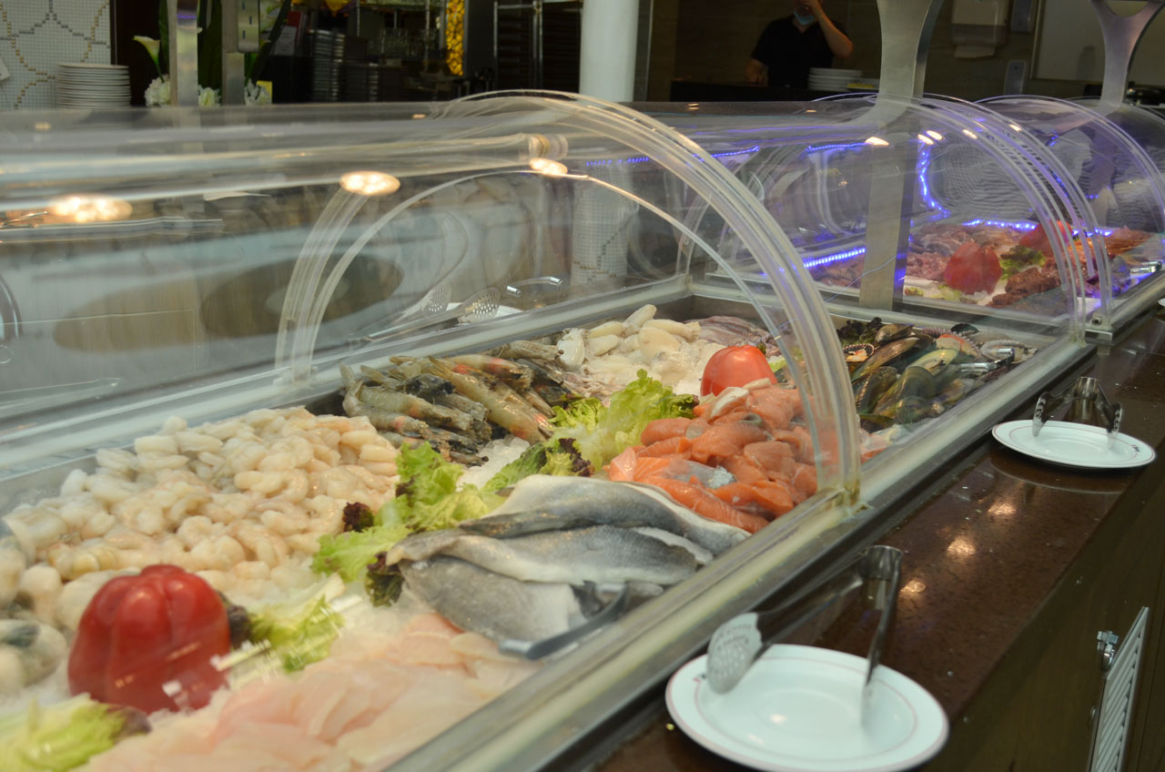 Wählen Sie an unserem Fleisch- und Fischbuffet mit Gemüse und Saucen Ihren individuellen BBQ Teller.